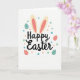 This card features the words “Happy Easter” centered in smooth black lettering, giving the design a gentle, affectionate tone like a note shared between close friends. Just above the text, two tall bunny ears in soft cream with blush-pink inner details rise up, as if a shy little 🐰 is leaning in. The background is white, keeping everything airy and focused on the central message. Around the greeting, small confetti-like dots in teal, mint, and soft coral drift across the space, adding a light, celebratory flutter 🌷. Mixed in are several egg-shaped decorations in muted coral and teal, arranged loosely around the wording so the layout feels balanced and friendly. Each egg is decorated with neat horizontal rows of tiny white dots, adding texture without crowding the center. The ears sit directly above the black “Happy Easter” text, while the teal and coral eggs and scattered dots frame the message on the white background.