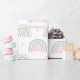 Pastellfarbene, pastellfarbene Regenbogenfarben in sanften Rosa-, Grün-, Gelb- und Grautönen. Dieses skurrile Design, das von Herzen und zarten Punkten geprägt ist, eignet sich perfekt, um Babyzimmern, Spielzimmern oder einer kinderfreundlichen Umgebung eine Touch Charme zu verleihen. Die sanften Pastellfarben schaffen eine beruhigende Atmosphäre, während die lustigen Regenbögen und Herzen ein Gefühl von Freude und Wunder wecken.