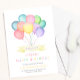 Une invitation d'anniversaire pour un ballon arc-en-ciel en aquarelle. Sur un arrière - plan blanc, des ballons multicolores rouges, jaunes, bleus, roses, verts et violets sont flanqués d'une bannière contenant le nom de l'enfant. Le texte en arc-en-ciel dit Joyeux anniversaire. Personnalisez en éditant avec vos détails uniques.