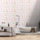 Seamless watercolor illustration of pastel macarons in soft pink purple yellow and green tones paired with small floral elements arranged in a gentle repeating pattern on a light background
