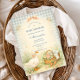 Ein charmantes, märchenhaftes Babyshower-Design mit einer süßen Wasserfarben-Gans, die neben einem Nest mit pastellfarbenen Eiern steht. Zarte Frühlingsblumen und sanftes Grün schaffen eine idyllische ländliche Szene, während eine rosafarbene Schleife und ein Hintergrund mit Salbei-Gingham-Muster einen gemütlichen Cottagecore-Touch hinzufügen. Der vintage Illustrationsstil und die weiche Pastellpalette geben diesem Design ein zauberhaftes Kinderzimmer-Feeling, perfekt für eine spielerische und herzliche Babyparty.