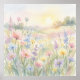 Eine friedliche Wiese voller zarter Wildblumen leuchtet im sanften Licht einer aufgehenden Sonne. Weiche Wasserfarbenstriche und pastellfarbene Töne schaffen eine träumerische Landschaftsszene, in der Blüten still in der Morgenluft schwanken.