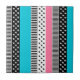 Patchwork aus mehrfarbigen Stoffstreifen in Rosa, Blau, Schwarz und Weiß.