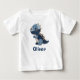 Dieser personalisierte Baby-T - Shirt verfügt über einen niedlichen T-Rex-Dinosaurier, der aussieht, als ob er aus gehefteten Denim-Patches in verschiedenen Blautönen gefertigt wurde, was ihm einen charmanten, handgefertigten Patchwork-Look verleiht. Stickereiartige Details wie Knopfaugen, winzige Nähte und weiche, abgenutzte Kanten verleihen dem Ganzen ein Vintages und gemütliches Ambiente.