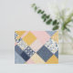 Eine hübsche Postkarte mit gemustertem Design im Patchwork-Stil. Der Druck verbindet gelbe, blaue, rosa und weiße Abschnitte mit geschmückten Blumen.