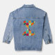 Diese Denim-Jacke hat ein Bauhaus-Design von Quadraten mit merkwürdigen Formen innen, wiederholt über das Design.