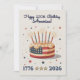 Celebrate 250 years of the United States with this festive 5" x 7" flat card featuring a whimsical patriotic cake wrapped in stars and stripes, sparkling candles, scattered stars, and cheerful red, cream, and blue accents. The front sets the tone with a playful birthday-inspired design, while the coordinated back provides space for your event details in a soft, polished layout. Perfect for summer gatherings, civic events, neighborhood parties, historic milestone celebrations, and star-spangled Fourth of July invitations.