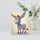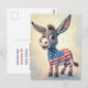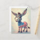 A charming, wide-eyed donkey stands proudly wrapped in a whimsical American flag design, featuring bold red and white stripes and a field of white stars on blue. Illustrated in a playful, storybook style with soft shading and warm pastel tones, this patriotic donkey radiates friendliness and lighthearted charm.