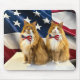 Schöne Ingwer Maine Coon Katzen, Tony und Teddy, stehend vor einer US-Flagge. Rot, Weiß und Blau patriotisches Thema.