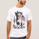 Dieser weiße T - Shirt besticht durch ein charmantes und patriotisches Design. Eine Schwarz-Weiß-Abbildung zeigt einen lächelnden Hund mit einem Cowboyhut und einer roten Bandana. Der Hund ist mit einer amerikanischen Fahne drapiert, was eine Touch nationalen Stolzes hinzufügt. Im Hintergrund steht ein Kaktus, der das Thema Western ergänzt. Dieser T - Shirt bietet eine lustige und stilvolle Möglichkeit, Ihre Liebe für Hunde und Land zu zeigen.