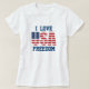 Der T - Shirt der Frauen wird in Weiß mit einem patriotischen Druck der USA-Flagge gezeigt. Text: I Liebe Freiheit Anpassen Sie dieses Objekt oder kaufen, wie es ist.
