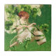 Fliesen mit einer schönen irischen Klasse, die keine Angst hat, auf einer Pfeife mit grünem Band für den Geschirr in die Luft zu fliegen. Umgeben von Kleeblatten ist sie ein zauberhafter St. Patrick's Day Gruß.