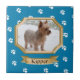 Die Liebhaber des Haustieres werden dieses Pfotendesign-Haustierrahmen mit dem Foto ihres Lieblings-Vierbeiner lieben. Fügen Sie einfach ein beliebtes Foto und einen Namen hinzu und Sie haben den perfekten Sake. Die Tile hat ein weißes Pfotenmuster mit blauem Hintergrund.