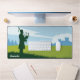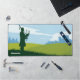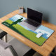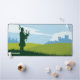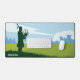 Tapis de bureau graphique représentant un paysage écossais avec un homme en silhouette dans un kilt jouant de la cornemuse, debout sur une colline au milieu d'un champ vert. L'arrière - plan contient un château et des arbres et quelques nuages dans le ciel. Ajoutez une touche écossaise à votre bureau !