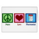 Ein Friedensschild, ein Herz und eine verschreibungspflichtige Tablettenflasche auf einer niedlichen Grußkarte für jemanden, der in einer Apotheke arbeitet.