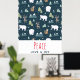 Ein Poster mit einem skurrilen festlichen Muster. Eisbären, Rentiere, Bäume, Füchse und Schneeflocken. Auf dunkelgrünem Hintergrund. Im Text steht: Peace Liebe & Joy.