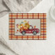Erntedank Grußkarte mit Vintagem roten LKW gefüllt mit Kürbis im Fall karierten Hintergrund. Fügen Sie Ihre eigene Nachricht auf die Rückseite.
