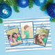 Schöne himmelblaue Linien zieren den Hintergrund dieser modernen Foto Collage Weihnachtskarte. Personalisieren Sie Ihre 12x18 Familienfotos und tauschen Sie die 3 Fotos durch Ihre eigenen glücklichen Kinder aus. Die perfekte Weihnachtskarte der Strandfamilie, die PEACE LIEBE JOY in chic blauen Typografie neben jedem Foto liest. Passen Sie den Rücken mit Ihrer eigenen Nachricht und den Namen Ihrer Familienmitglieder für eine helle, fröhliche Urlaubskarte an. Verwenden Sie 3 farbenfrohe Fotos auf dieser fröhlichen Weihnachtskarte.