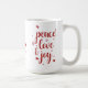 Genießen Sie diese Tasse des Urlaubs mit den Worten Frieden Liebe und Freude in der Schrift Typografie und Rote Rentiere in der Mitte.