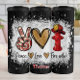 This vibrant graphic design is a tribute to the Fire Wife community. It features a distressed, black and white background surrounding a trio of symbolic elements: a peace sign (made of a Maltese Cross pattern), a glittering gold heart, and a red fire hydrant topped with a fire helmet. The script below reads "Peace Love Fire Wife", making it a charming and supportive design for a firefighter's spouse.