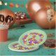 Ein Blumenschild in Rosa, Gelb, Orange, lila, Grün, Weiß und Schwarz schmückt diesen festlichen Papierteller.