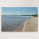 A peaceful stretch of shoreline along Big Traverse Bay on Lake Superior, where gentle waves meet soft sand under a bright blue sky. The curving beach and calm water capture the quiet, open beauty of Michigan’s Upper Peninsula.