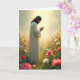 This card shows a solitary figure with flowing dark hair and a beard standing in a wide meadow, wrapped in warm golden light that softens the whole scene 🌷. He wears a simple, light-colored robe that falls to the ground, and his head tilts down as his hands press together, as if sharing a quiet, tender promise with someone just beyond the frame. Placed slightly left of center, he’s surrounded by a thick spread of wildflowers that stretches across the foreground and mid-ground. The flowers form a textured carpet of pinks, reds, whites, and oranges, with gentle blur that makes the field feel calm and distant 🐇. Across the upper area, a short greeting appears in small, light lettering, set near the top against the bright sky. The sky itself is pale and glowing, with soft rays breaking through and outlining the figure’s hair and shoulders. In the lower portion, the meadow is densely dotted with blossoms, and warm light spills between the petals.