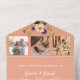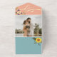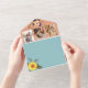 Unsere elegante, moderne böhmisch-pastellblaue und pfirsichblaue Hochzeit in einem Rahmen, geschmückt mit einem romantischen goldgelben Seilherz und zarten Aquarellfarben-Blume, begleitet von fröhlichen Sonnenblumen. Mit Platz für vier individuelle Bilder des Ehepaares, erfasst diese Einladung das Wesen Ihrer Liebe. Erleben Sie die zeitlose Schönheit dieser exquisiten Einladung und versprechen Sie einen Hochzeitstag voller Romantik, Freude und gepflegter Erinnerungen. Vergessen Sie nicht, Ihre Fotos, Websites und QR-Code für UAWG und zusätzliche Informationen hinzuzufügen.