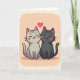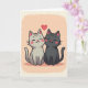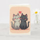 This cute greeting card shows two sweet cats cuddled up together on a soft peach background that looks lightly painted. A light gray tabby sits close against a darker charcoal cat, and both are outlined with a dark line that makes them stand out. Their eyes are closed with small, happy smiles, and each one has rosy blush on its cheeks. A bright red heart floats above their heads, making the message of love clear ❤️. Their tiny noses are shaped like little hearts, and a faint shadow under them helps set them in place. There isn’t any text on the card, so the picture does all the talking in a simple, heartfelt way 💌🍫.