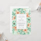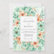 This design features a soft and romantic aesthetic, blending mint green foliage with warm peach blossoms. Delicate vines and petals create a fresh, seasonal atmosphere perfect for springtime. The color palette of pastel orange and seafoam green evokes a sense of breezy elegance. Peach blossoms are displayed alongside lush greenery.