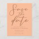 Peach ist die neue Trendfarbe für die Sommerbriden. Unsere Pfirsichhochzeit Save the Date Postcard bietet elegante hellbraune Schrift für eine trendige, minimalistische Veranstaltung am Nachmittag für eine weibliche Braut, die Lieben, aktuelle und moderne bleibe.