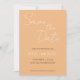 Einfache Hochzeit im Stile rette den aktuellen Einladungen, die weiße, stilisierte Schriften auf einem trendigen, pfirsichfarbenen Hintergrund enthalten. Bearbeiten und ersetzen Sie Namen, Datum und Position mit Ihrem eigenen. Wählen Sie Ihre Einladungsgröße und Ihren Papierstil aus.