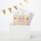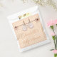 Niedliche Babyschuhbekleidung, die an eine rustikale Saitenreihe geklebt ist. Pastel polka-dot Hintergrund mit anpassbarem Namen und Event. Pfirsichgrenze.