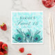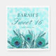 Elegante glitzernde aquamarine und blaue Pfauenfedern Sweet 16 Geburtstagsparty-Servietten personalisiert mit dem Namen des Ehrengästes.