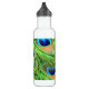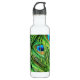 Nahe Federn eines Pfauens auf einer Wasserflasche. Nehmen Sie ein wenig Natur mit auf Ihre Reisen.