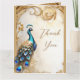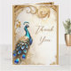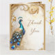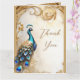 Ein Single-3D-Pfau mit strahlenden Blau- und Goldfedern steht majestätisch vor einem im Jugendstil inspirierten Hintergrund mit wirbelnden Tandrien am oberen Rand und einem blassbeigen Marmorhintergrund. Das Design wird auf der Innenseite der Karte wiederholt, und es erscheinen bearbeitbare Vorlagen von Kalligraphie-Skripten auf dem Cover und im Inneren für Ihre personalisierte Botschaft an Gäste und Familie.