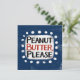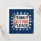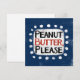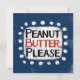"Peanut Butter, Bitte" ist ein niedliches Textdesign in blau mit schwarzem und rotem Text, zusammen mit einer weißen Akzent-Form und weißen texturierten weißen, weißgetönten weißen Punkten, die ihn umgeben.