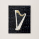 Dieses Ausrüstungsbeschreibungen, die eine Pedalharfe gegen einen dunklen Hintergrund mit musikalischen Anmerkungen füllte.
