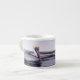 Profil eines Pelikans - das braune Pelikan auf dem Originalfoto von MaeFlowers auf diesem Espresso Cup gleitet durch das Wasser eines Kanals an der Golfküste Floridas. Die Seite eines Bootes im Hintergrund zeigt die schimmernden Reflexionen des blauen Wassers. Das Foto ist in Blues-, Weich- und Braun-Tönen gehalten, auf dem Kopf des Pelikans ist eine gelbe Touch.