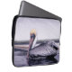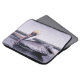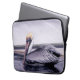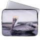 Profil eines Pelikans - das braune Pelikan in der Originalfotografie von MaeFlowers auf diesem 13" Laptop Sleeve gleitet entlang des Wassers eines Kanals an der Golfküste von Florida. Die Seite eines Bootes im Hintergrund zeigt die schimmernden Reflexionen des blauen Wassers. Das Foto ist in Blues-, Weich- und Braun-Tönen gehalten, auf dem Kopf des Pelikans ist eine gelbe Touch.