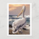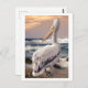 Postcard mit dem wunderschönen Bild eines Pelikans, das am Strand am Meeresufer stehend ist und in den Sonnenuntergang blicken kann.