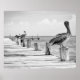 Das Poster wird mit einem Schwarz-Weiß-Foto eines rustikalen Docks mit Pelikanen gezeigt. Passen Sie dieses Objekt an oder kaufen Sie, wie es ist. Bild