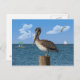 Dieser junge, unreife braune Pelikan, der an einem Posten am Meeresufer steht, macht eine großartige Postkarte.