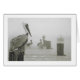 Eine Gruppe Pelikane schauen an, während ein Garneleboot es Ausweg im Nebel macht.