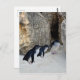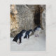 Am Strand ist eine Felshöhle abgebildet, in der drei Pinguine eine Zuhause gemacht haben