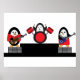 Eine bezaubernde Pinguin-Band. Ein Pinguin spielt Gitarre. Ein anderer Vogel spielt Bass und ein Drittel spielt Schlagzeug.