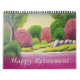 Dieser zweiseitige Standardkalender 2016 hat einen roten Draht, ein künstlerisch naives Gemälde mit Garten mit Steinweg, grüne Büsche, kirschfarbene Büsche und den Ausdruck "Happy Retirement" auf einer Kirsche verblasste Streifen in allen Monaten. Es ist ein eleganter Kalender zu feiern Ihre Pension und ein großes Geschenk für Ihre Freunde und Liebsten auch. Sie können es auch mit anderen Artcor7 persönlichen oder dekorativen Accessoires bei Zazzle kombinieren.