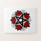 Schwarzes Pentagramm mit Muster, mit Blüte dekoriert, rote Rosen mit Blätter auf weißem Hintergrund. Tattoo-Stil.