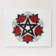 Schwarzes Pentagramm mit Muster, mit Blüte dekoriert, rote Rosen mit Blätter auf weißem Hintergrund. Tattoo-Stil.