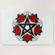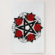 Schwarzes Pentagramm mit Muster, mit Blüte dekoriert, rote Rosen mit Blätter auf weißem Hintergrund. Tattoo-Stil.